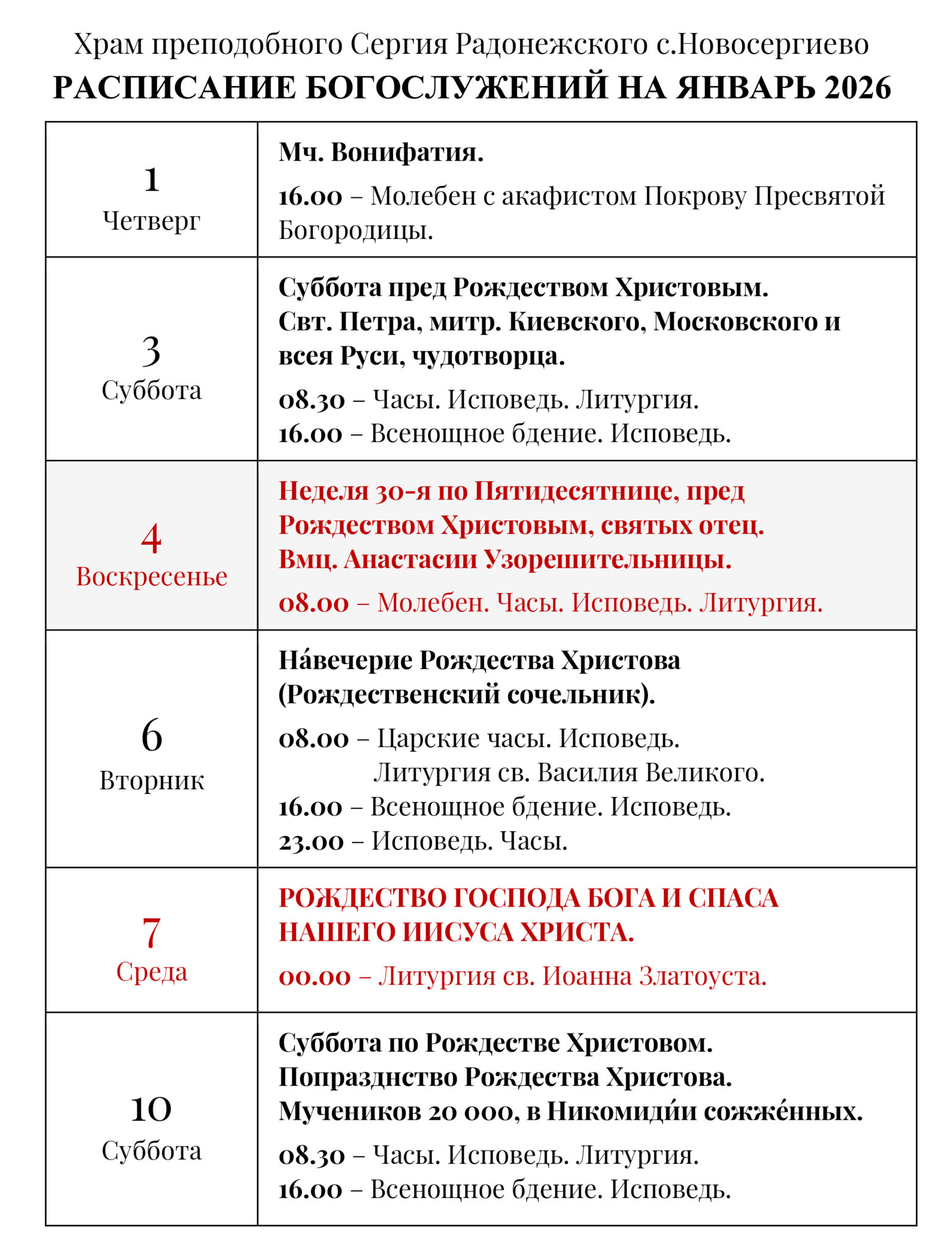 Расписание богослужений